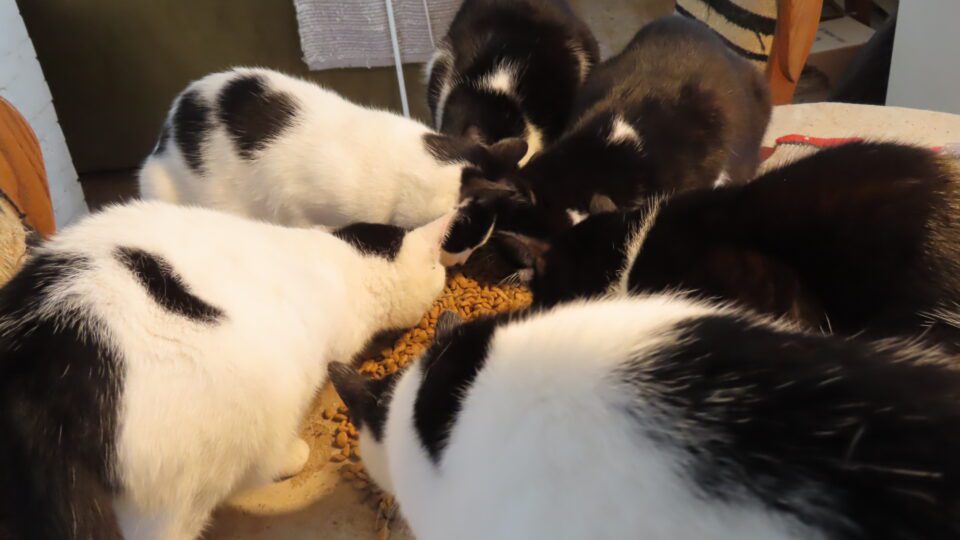 Cinq chats mangent des croquettes à mon arrivée. Ils avaient sans doute passé la nuit dehors.