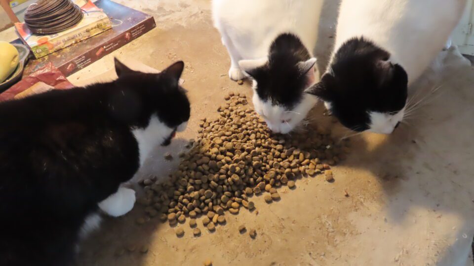 Voilà un autre point de vue sur ces trois chats mangeant des croquettes.