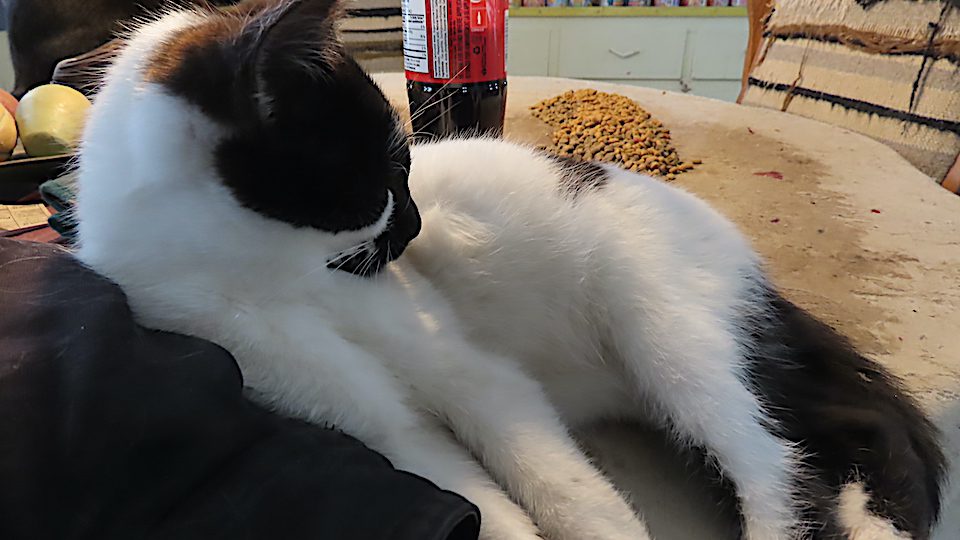 Ce chat est sur la tablette au-dessus de l’évier. D’être là permet de voir vers l’ouest. Et les chats aiment beaucoup cette place.