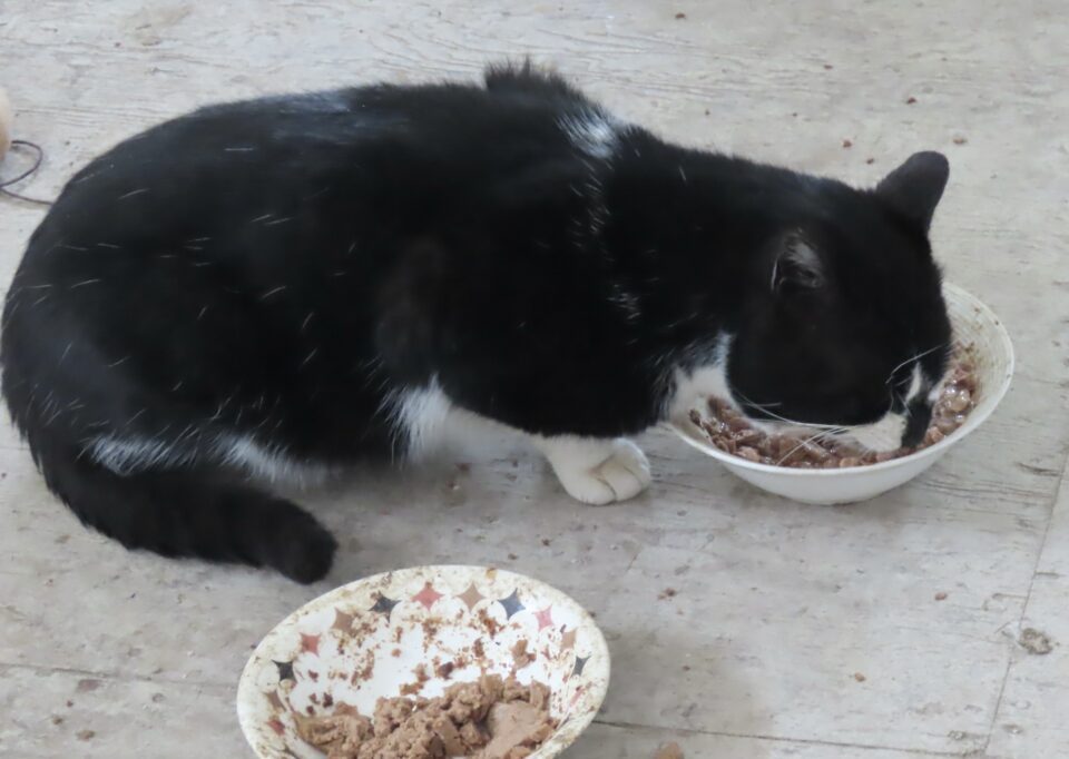 Le chat adolescent mange de la viande.