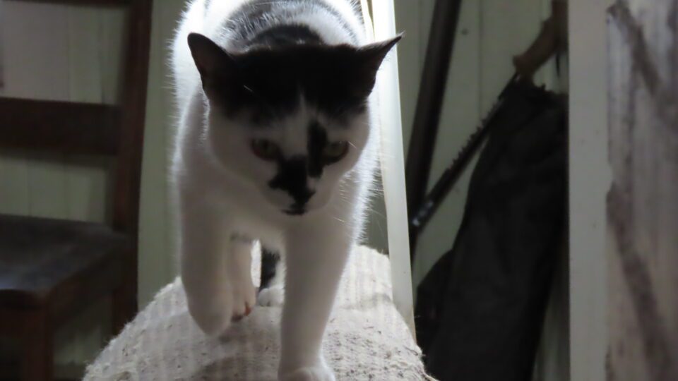 Ce chat, sous la lampe, marche sur le rebord de la causeuse.