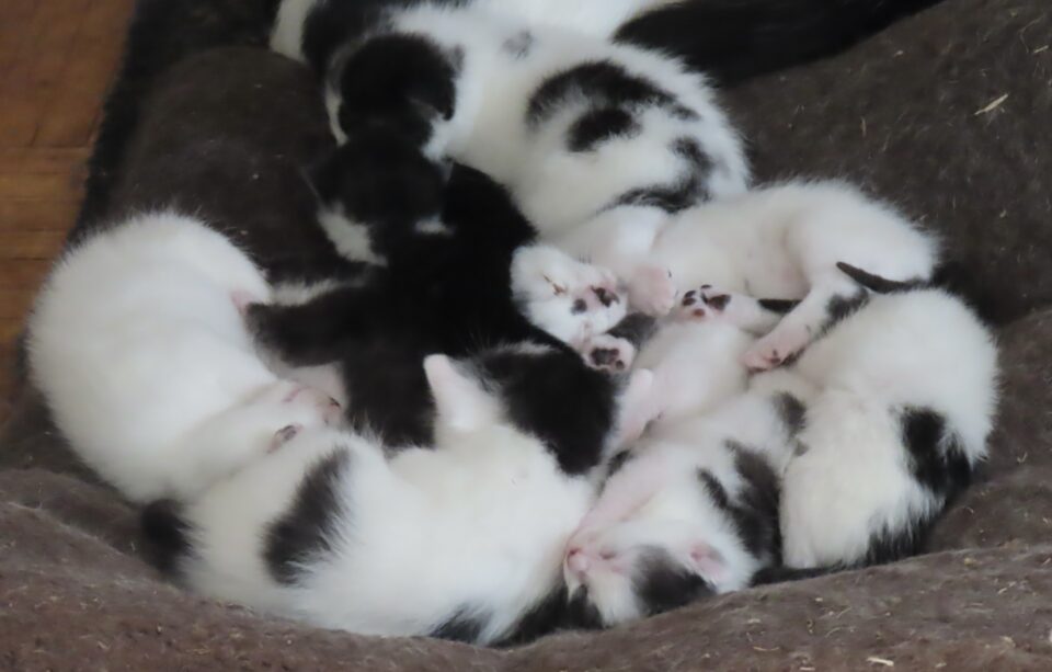 Les trois chattes ont décidé d’abandonner la boite de carton abîmée pour amener tous les jeunes chatons sur les matelas que j’avais proposés.
