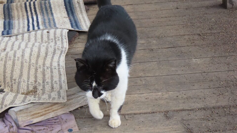 Voici le gros chat, l’adolescent. Il vient de sortir de la niche pour venir me voir au bout de la galerie avant.