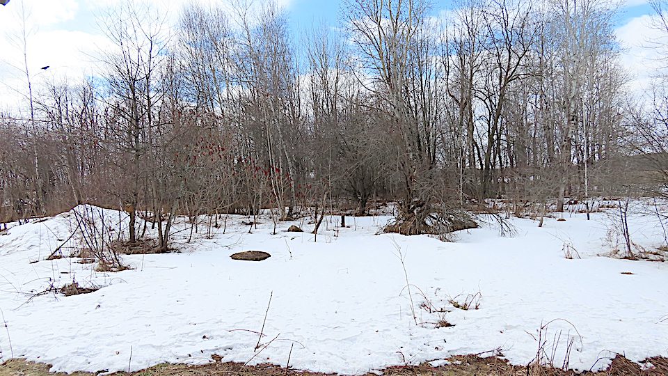 À l’extrême gauche, dans cette image, une corneille chante, car je viens de laisser au sol des morceaux de pain.