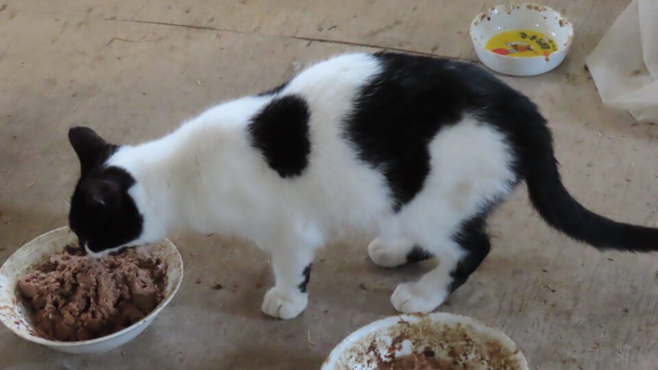 Un jeune chat mange de la viande.