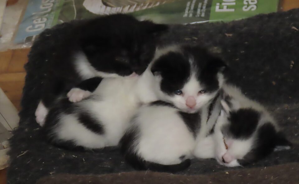 J’avais mis les très jeunes chats en deux groupes. Mais les chats, qui sont sans doute trois chattes, ont décidé de les mettre ensemble dans un boîte de carton réduite. Je me fie à ces chattes.