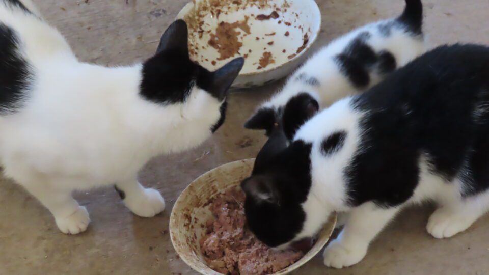 Assiette de viande et un tout jeune chat est avec les deux autres.
