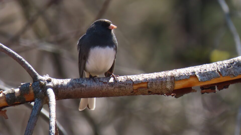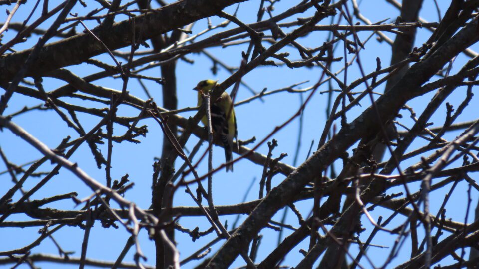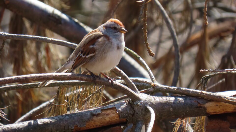 Ah, voici le Bruant chanteur (Melospiza melodia, Song Sparrow), arrivé sans doute des États. Il n’a dit chant encore, mais il est dans son temps.