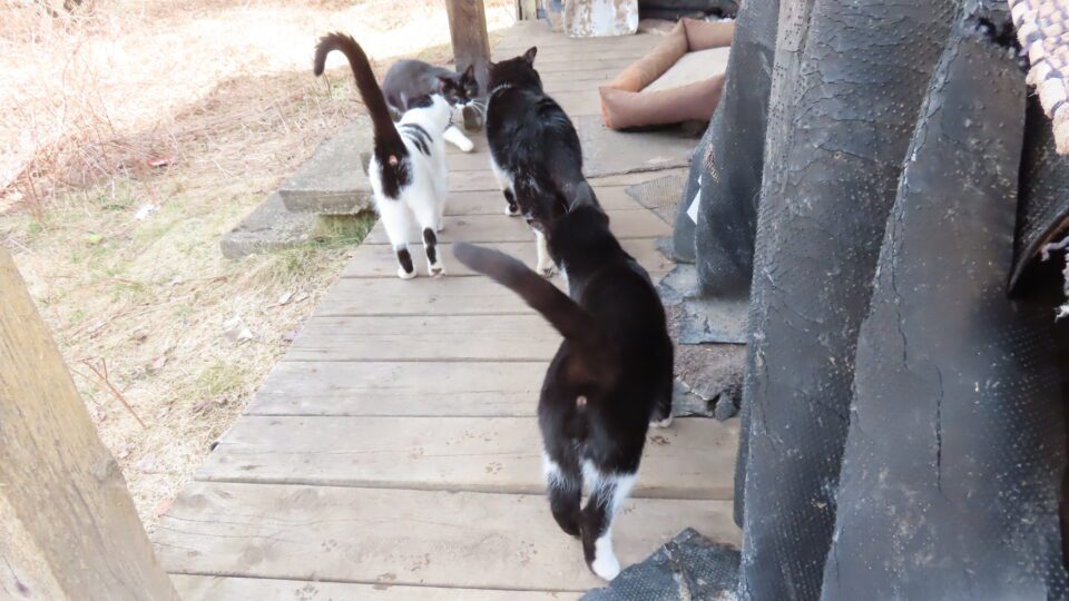 Les voilà qu’ils filent à la porte arrière, espérant manger à l’intérieur.