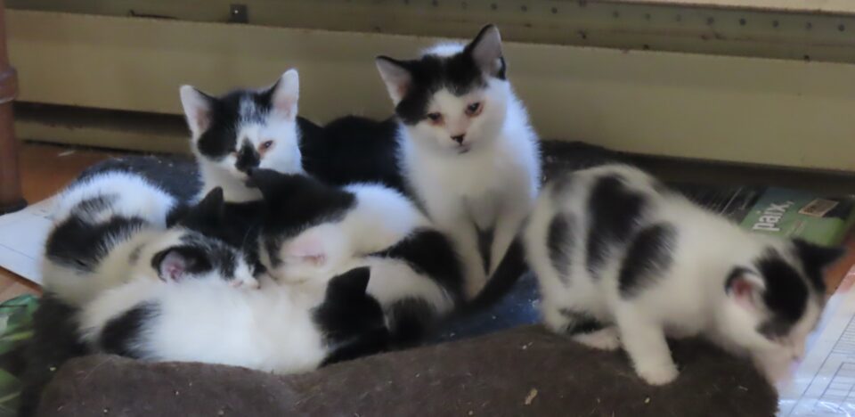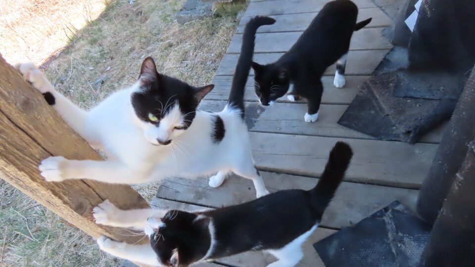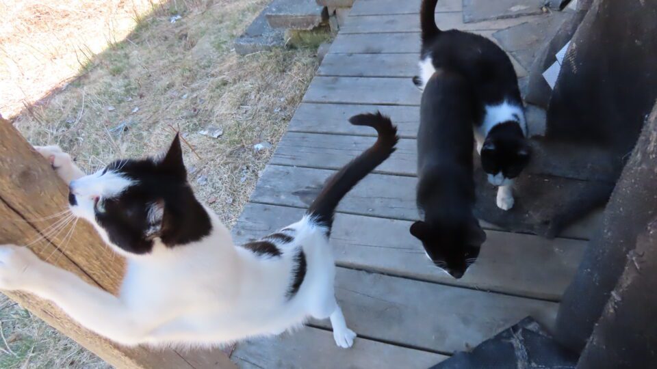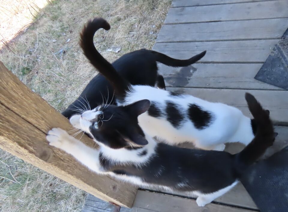 Les chats, dehors, sont heureux de ma présence. Et la chatte se fait les griffes sur un des poteaux de la galerie arrière.
