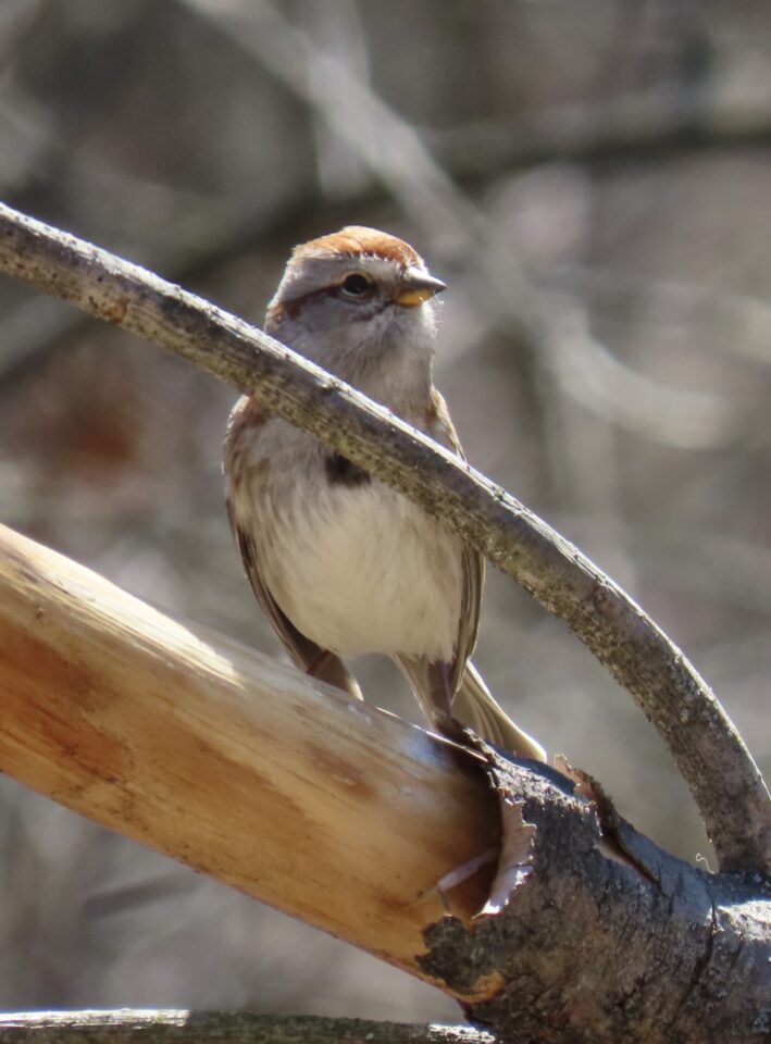 Ah, voici le Bruant chanteur (Melospiza melodia, Song Sparrow), arrivé sans doute des États. Il n’a dit chant encore, mais il est dans son temps.