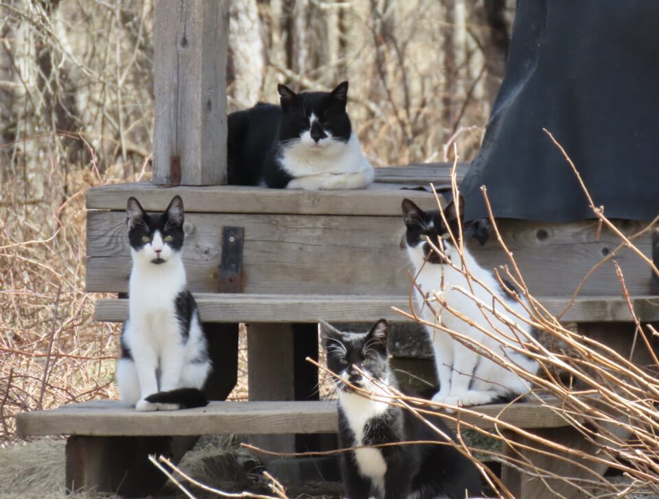 Voici les ROYS-CHATS. Ils viennent de me voir montant à pied et laissant la bagnole au chemin. Ils ont assurément passé la nuit en dehors de la maison. Ils sont adorables. Celui en haut sur la galerie est le chat adolescent.