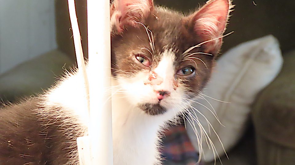 L’un des jeunes chatons, sous la lampe, me regarde.