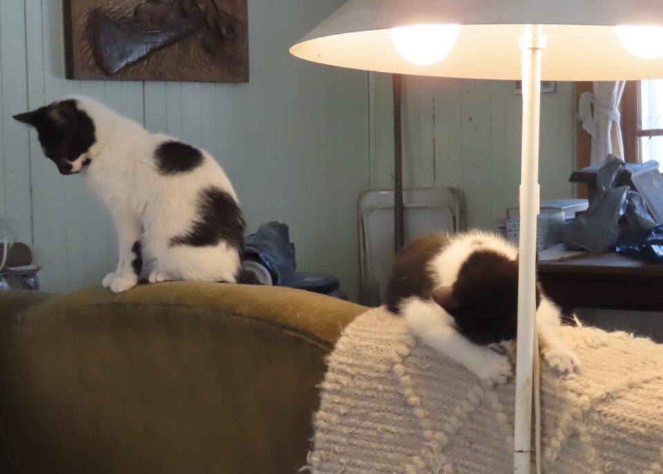 Et les chats se plaisent dans cette maison, car il fait tellement froid. Ici, vous avez la chatte et deux jeunes chatons.