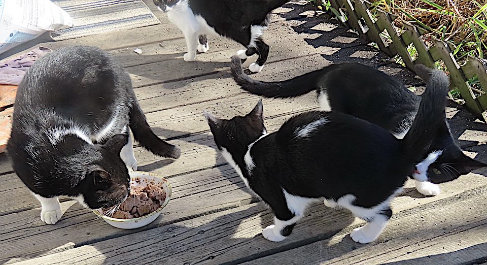 Ce chat adolescent vit une vie impossible à connaître. Je suis dans un rang, les voisins sont bien loin. Pour manger, ce chat peut se présenter. Et il peut s’absenter pendant plusieurs jours. Il est arrivé le 3 octobre vers midi pour manger. Et il fut de retour hier matin. Il attendait sur la galerie avant. Je vais vous dire : pendant qu’il mangeait, je le flattais et le flattais. Lui qui est craintif, il me laissait faire.